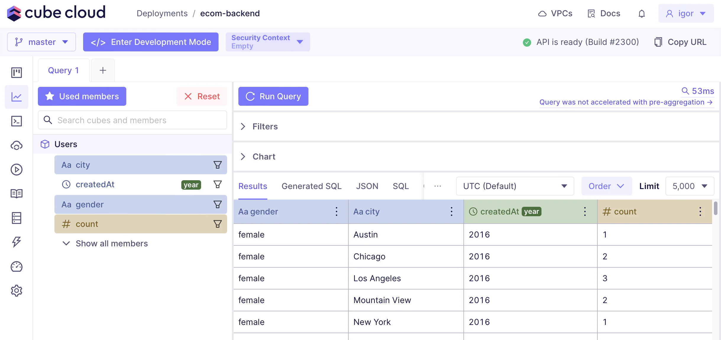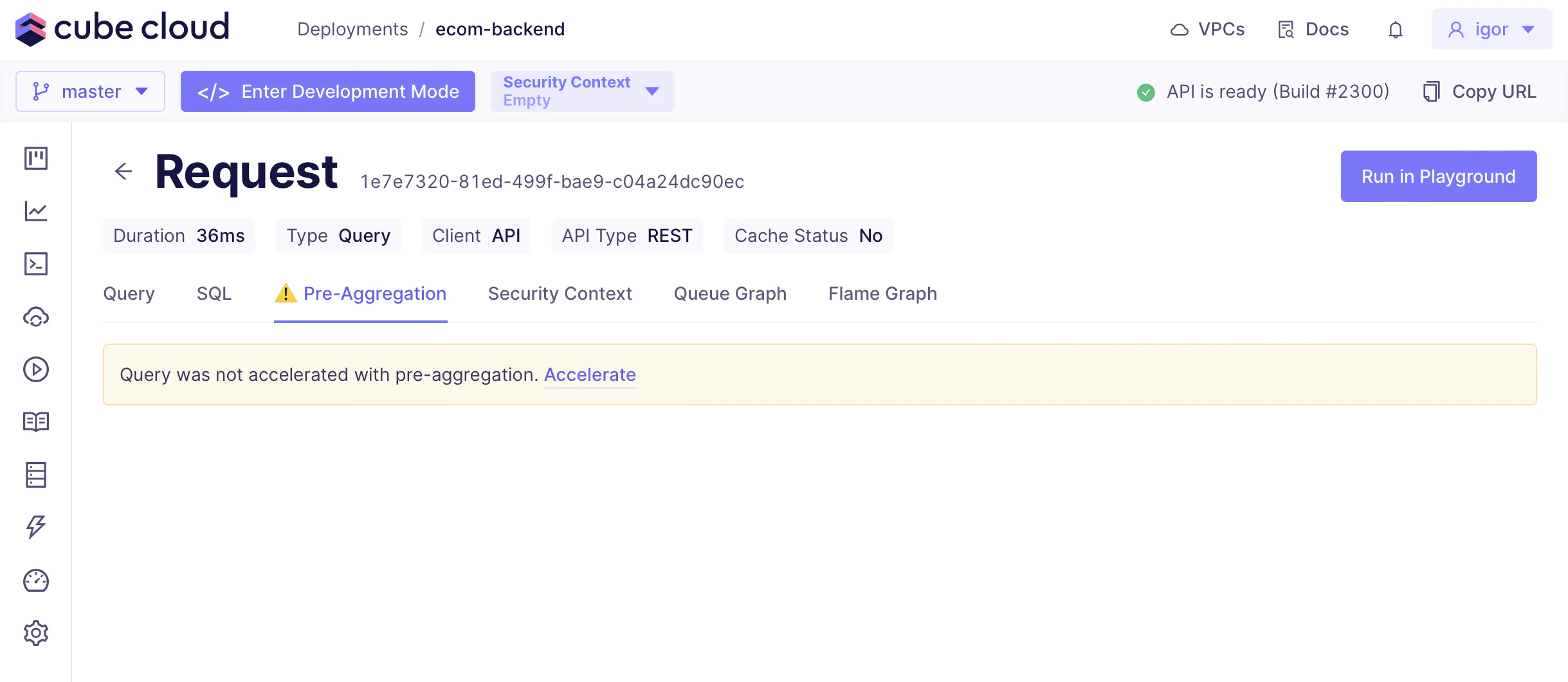 When you execute a query in Playground that has no matching pre-aggregations, you would see this notificaton. Clicking on it will open Rollup Designer with a suggested pre-aggregation: