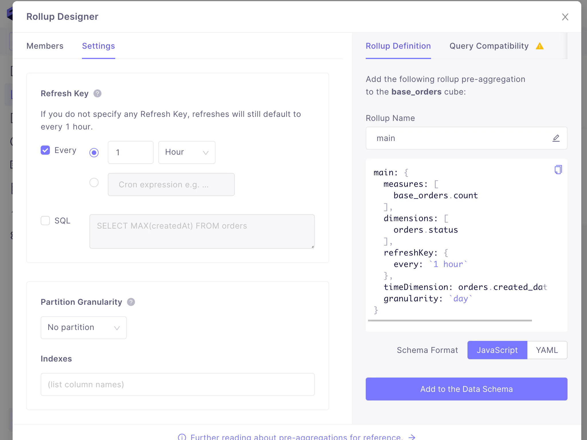 If desired, you can also modify settings such as the refresh key, the partition granularity, and indexes to further optimize the pre-aggregation by clicking the tab: